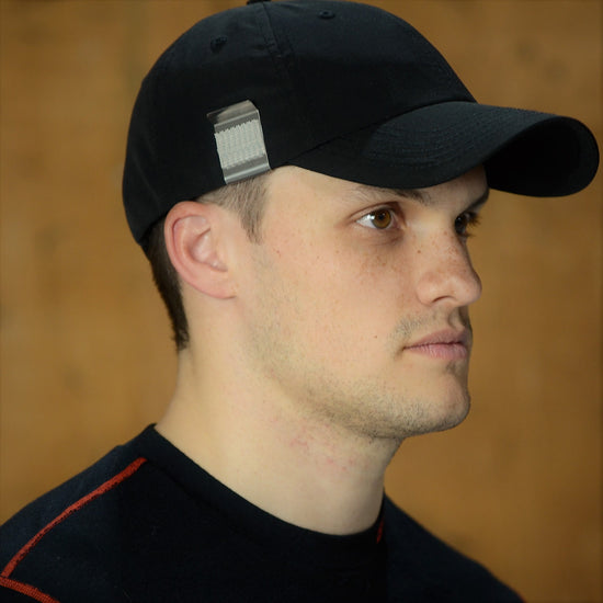 On the right side of your hat, slide the hat clip onto the hat.